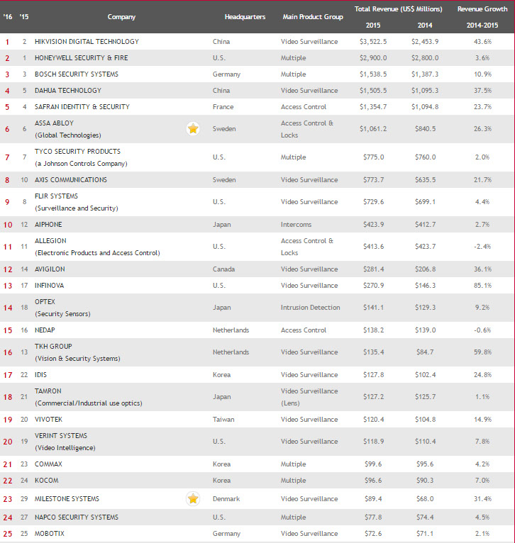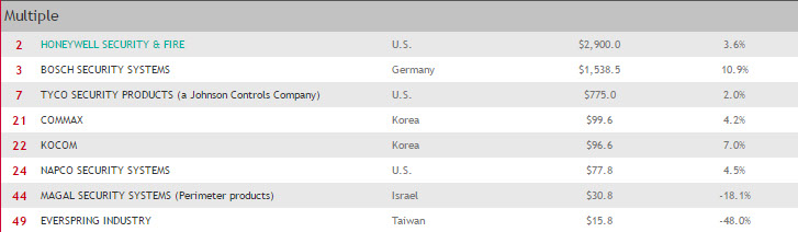 - A Honeywell, há 5 anos vinha sendo a maior empresa de segurança e agora está em segundo lugar. Perdeu o título para a Hikvision, que avançou uma posição;