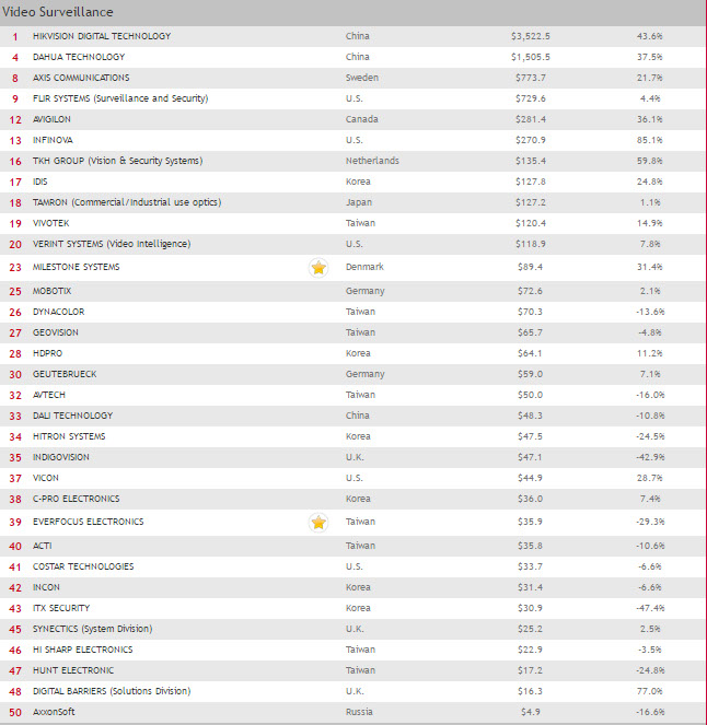 Vemos que os softwares VMS estão em alta: Uma das maiores empresas de VMS, a Milestone, aparece na 23ª posição, ganhando 6 posições (ganhou 10 posições em 2 anos!).