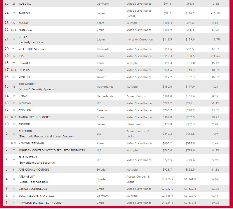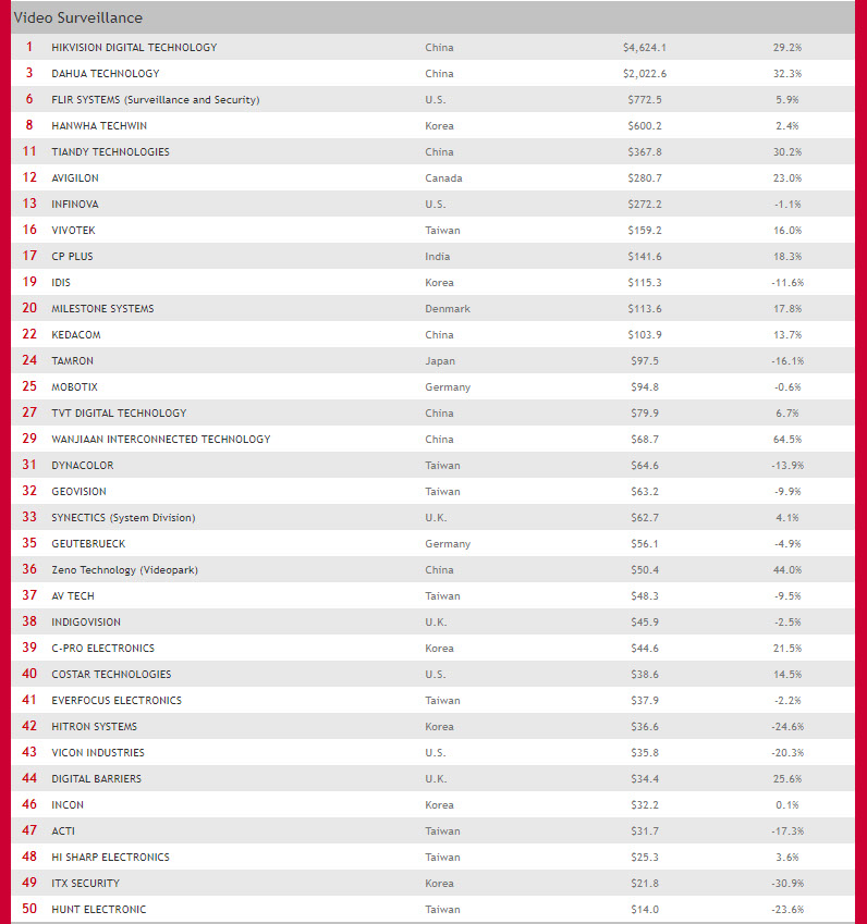 - Várias empresas chinesas entraram no rank das 50 maiores: Tiandy (11°), Kedacom (22°), TVT (27°), Wanjiaan (29°) e Videopark (36°)