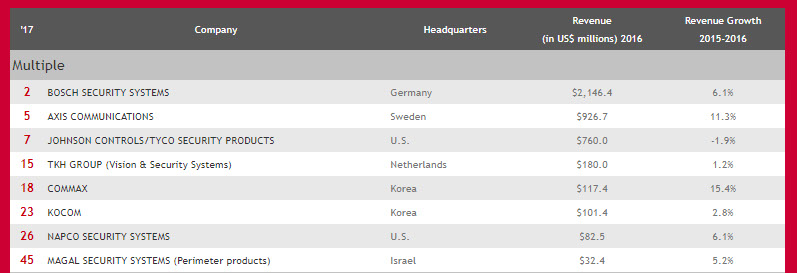 - A Honeywell, que por 5 anos se manteve como a maior empresa de segurança e tinha sido rebaixada para o segundo lugar em 2016, sumiu da lista. Seu lugar foi ocupado pela Bosch;